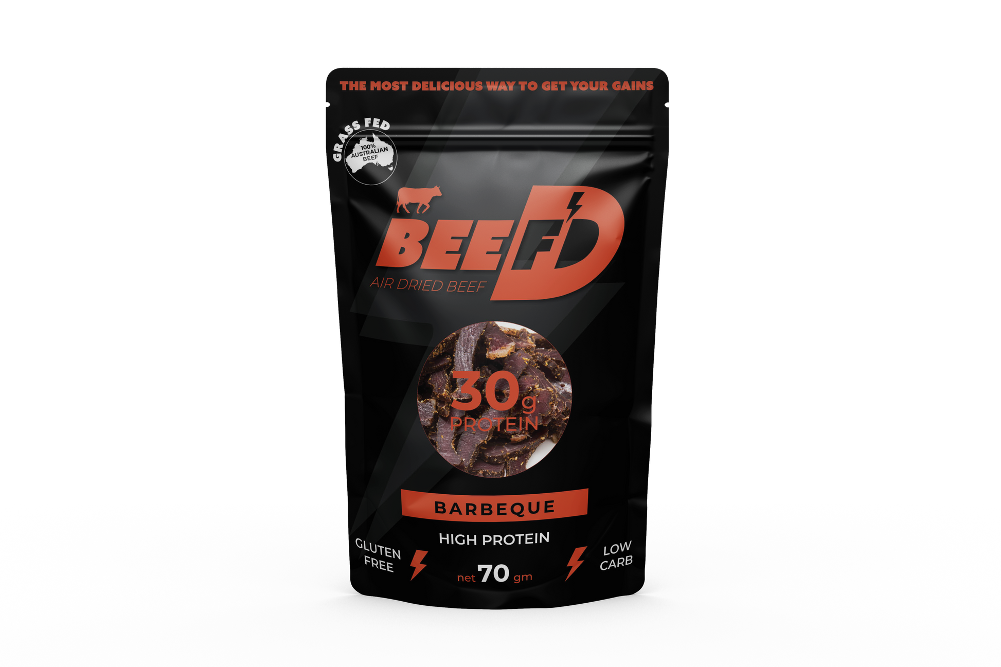 Beef’d - BBQ flavoured Air Dried Beef Biltong, the ultimate meaty protein-packed snack for fitness enthusiasts, the health-conscious and individuals who demand delicious natural snacks. Our Air Dried Beef is made with premium-quality Australian beef, carefully selected for its lean cuts and low-fat content, making it the perfect snack to help you stay energised and fuelled throughout the day. Bursting with natural beef flavour, low carb and gluten free your muscles and taste buds will thanks you for.